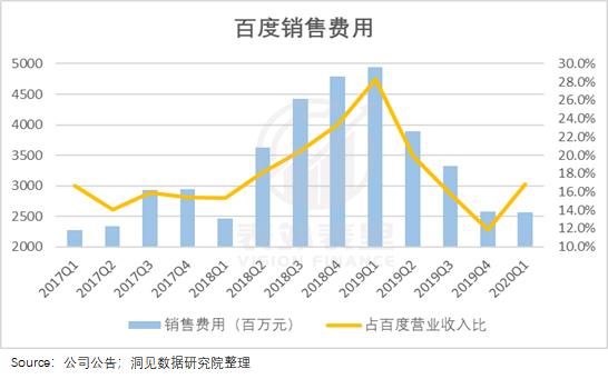 这些“胡萝卜”也很明显地表现在百度的财报数据中。2018Q2百度销售费用为36.28亿元,占营收比18.1%,相比此前15%左右的占比,可以看出明显的提速;此后2018Q3占营收比20.5%,2018Q4为23.3%。