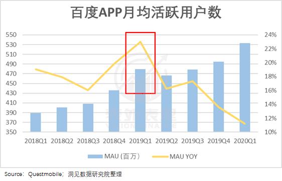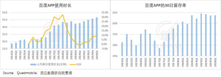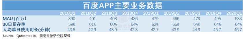 正因为内容增多和账户体系形成,百度似乎真的可以留住用户。根据Qusetmobile数据,百度APP的用户时长在2020Q1达到46.7分钟,30日留存率达到64%。