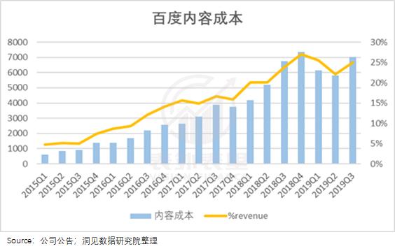 在2018年之后,与用户数量、销售费用一起明显提升的,还有百度的内容成本。2018Q1,百度内容成本占营收比从上一季度的16%迅速增长到20%,此后于2018Q4增长到27%的最高值。而迅速增长的内容成本背后,一边是对内部创作者的激励,一边是对外部内容采买以及合作。