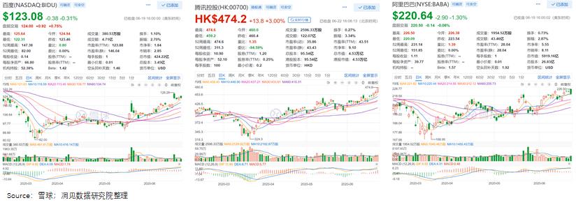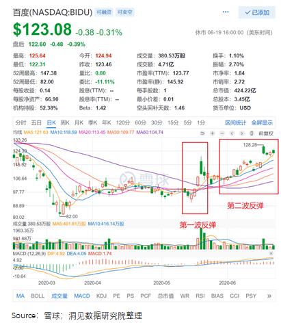截至6月19号,百度收盘价位123.08$,相比疫情影响的3月最低点,反弹力度达到了50%。对比之下,腾讯反弹力度为46%、阿里仅为17.4%。
