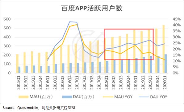 竞争环境和技术进化对百度来说,都属于长期条件。然而更值得关注的是,百度的用户数并非缓慢持续增长,而是从2018年开始爆发的,两年内日活从1.35亿增长至2.02亿,月活从3.39亿增长到了5.32亿。(*由于百度财报并未给出月活数据,此处我们仍使用Questmobile的数据)