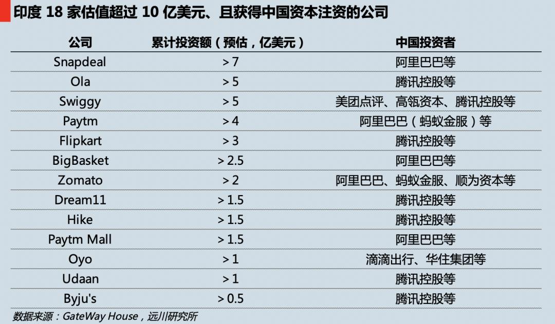 而在印度 30 家估值超过 10 亿美元的独角兽公司里,18 家有中国资本的身影。阿里和蚂蚁金服参投了其中 5 家,腾讯参投了 7 家。另外,美团点评、高瓴、滴滴、复星、汉庭也参与到了对印度的初创投资。