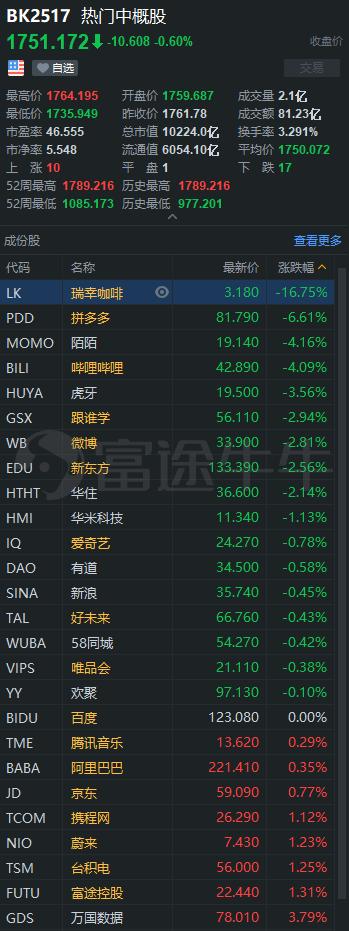 其他中概股方面,跌幅较大的有:玖富跌27.11%,品钛跌16.78%,瑞幸咖啡跌16.75%,36氪跌12.09%,兰亭集势跌11.63%,嘉银金科跌11.29%,和信贷跌11.11%,房天下跌9.68%,金融壹账通跌8.54%,信而富跌6.79%。