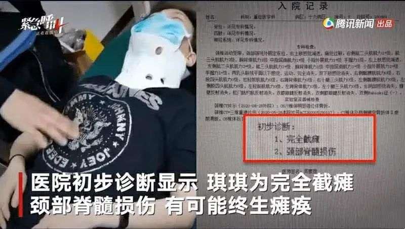 前面提到的出事女研究生琪琪,就是脊髓遭遇横贯性损伤造成的完全性截瘫。据病床上的琪琪回忆,落地后感觉背部如同被硬物硌住,随后全身发麻无法动弹。