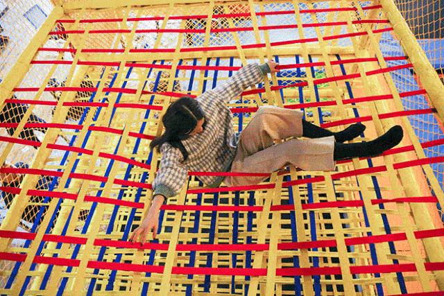 比如新晋热门“蜘蛛塔”(又名“一漏到底”或“十八层地狱”),一共数十层,每层密布经纬网格,游戏者攀爬到高处后,仰着一层层往下落到垫子上。