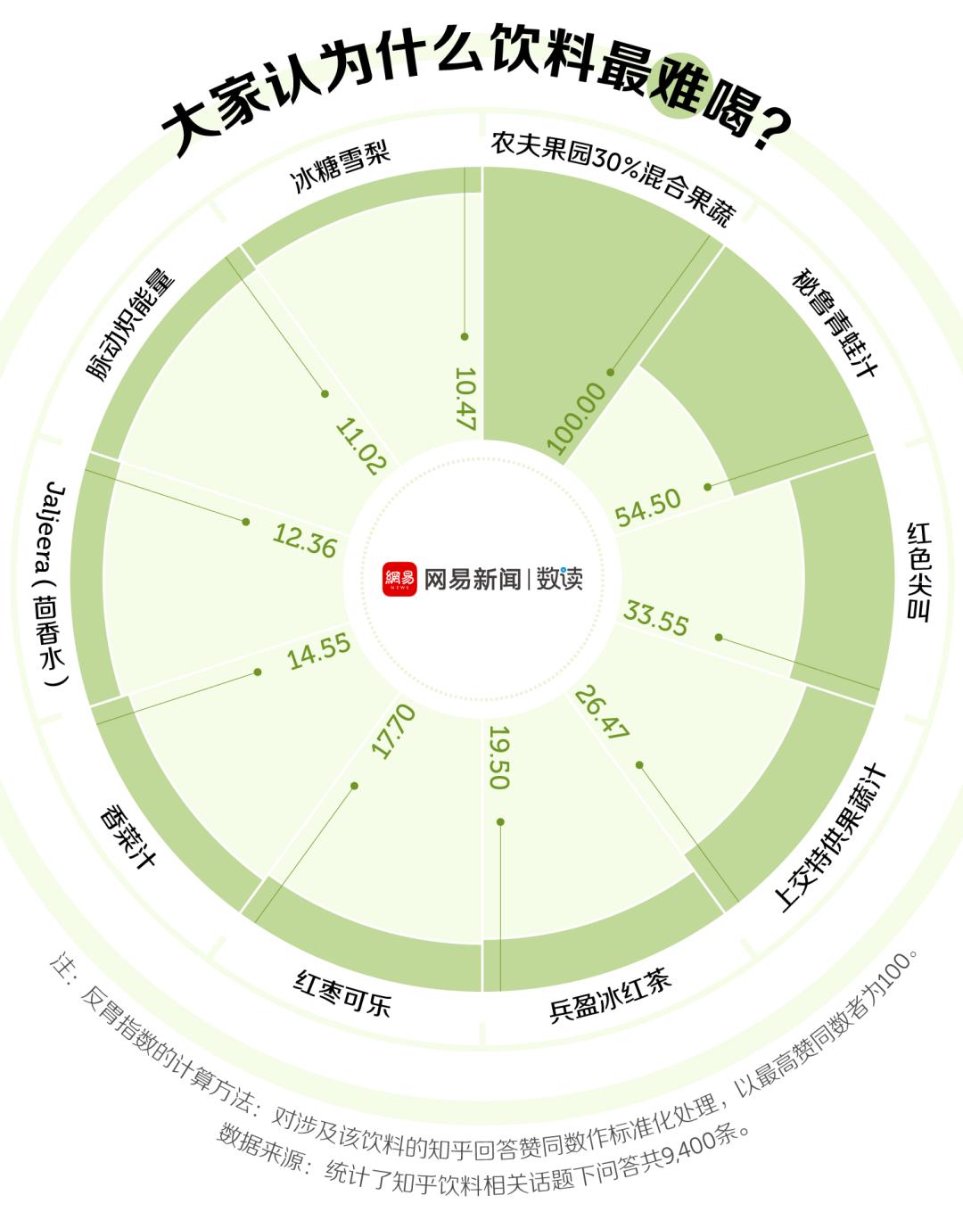 数读菌还统计了知乎网友最讨厌喝的饮料,发现了前十中有四种属于果蔬汁,例如排名第一的“农夫果园30%混合果蔬”,混合了多种不同的水果和蔬菜,但口味并不被一些消费者接受。