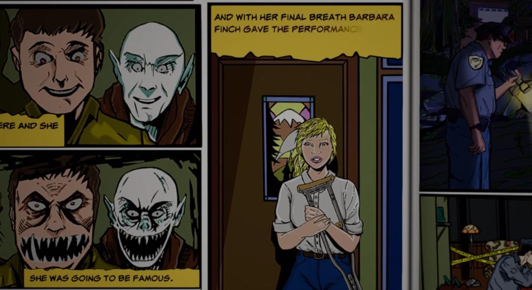 例如,在关于过气童星芭芭拉·芬奇的回忆中,整个故事以一本美式漫画书的形式呈现,讲述芭芭拉寻找失踪男朋友瑞克所经历的冒险;漫画书被包装成传统的恐怖故事风格,由语调夸张的旁白叙述每个漫画格子中的内容;许多漫画格子都有交互性的片段,玩家需要进行简单的交互或解谜才能完成这个漫画格子、到达下一个漫画格子。