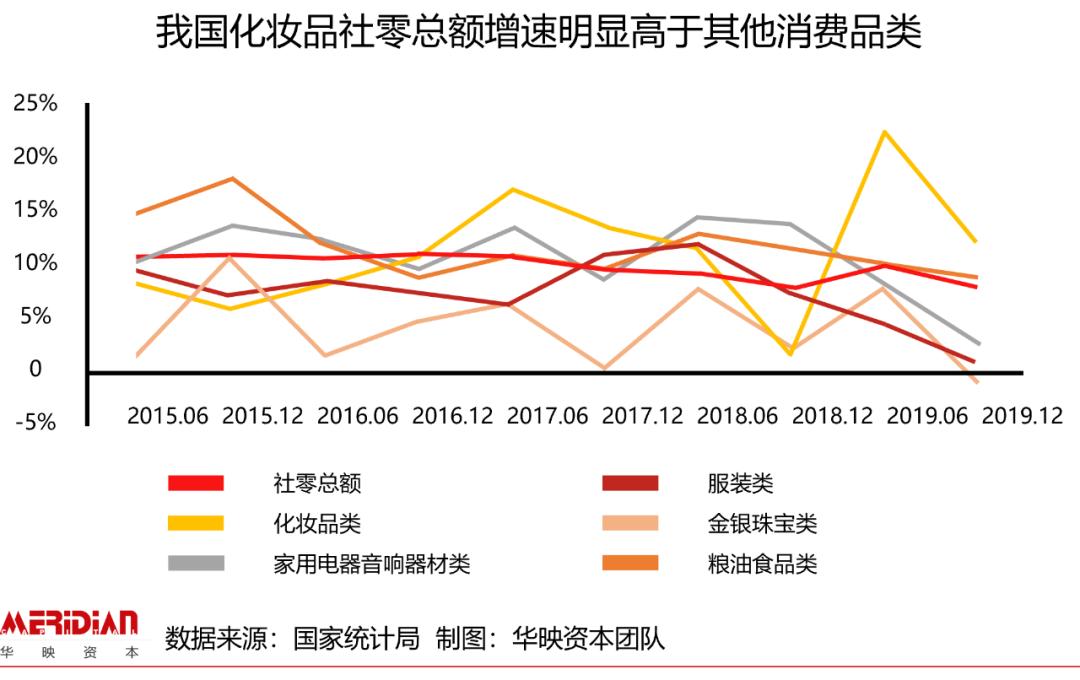 美妆个护的强劲增长在不断加速。我国化妆品类社零总额长期保持2位数增长,明显高于社零整体增速和其他可选消费品类增速。2019年,美妆、个护、家清品类增速大身位领跑整体快消品市场。