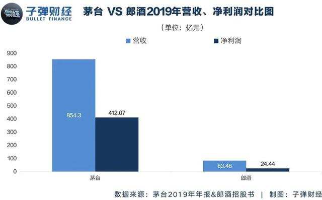 原因无它,两家企业实力差距实在太大,郎酒基本处在被“吊打”的状态:2019年,茅台营收为854.3亿元、净利润412.07亿元,而郎酒近几年虽然已经有比较大的发展,但营收、净利润只有83.48亿元、24.44亿元,不到茅台的十分之一。