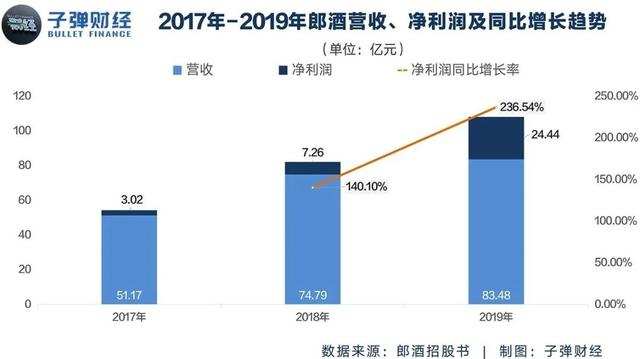 郎酒招股书显示,2017-2019年,郎酒实现营收51.17亿元、74.79亿元、83.48亿元;净利润为3.02亿元、7.26亿元、24.44亿元,增长幅度较大,2018年、2019年的净利润同比增长率分别为140.10%、236.54%。