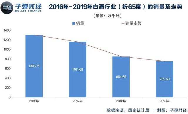 要知道,近几年,我国对酒类的需求已经有所降低,进而影响了白酒销量。据国家统计局数据显示,2016-2019年白酒行业(折65度)的销量分别为1305.71万千升、1161.68万千升、854.65万千升、755.53万千升,四年时间,白酒总销量下降了42.14%。