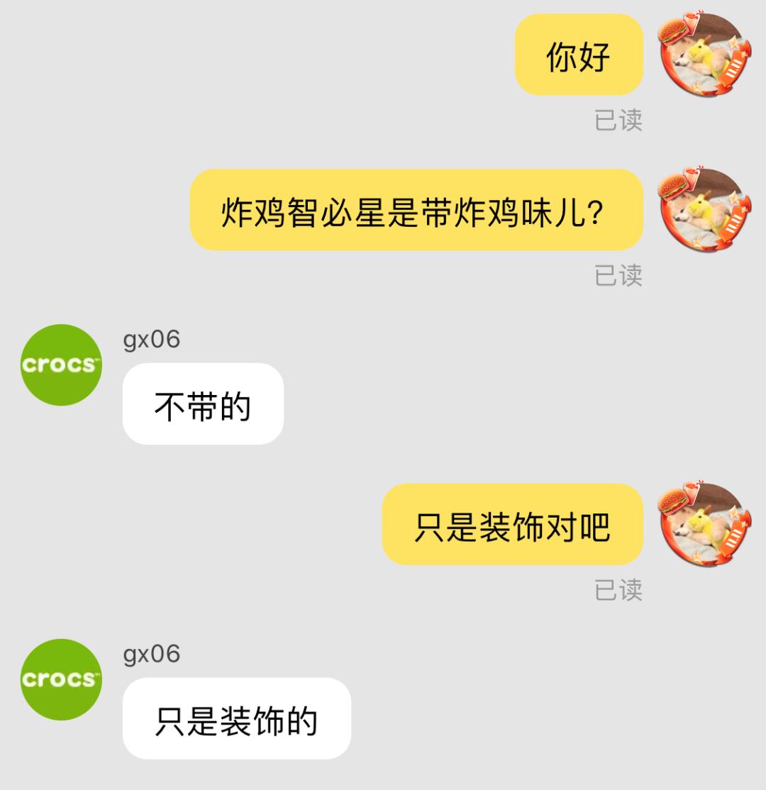 “遗憾”的是,据我们向crocs官网客服了解,以假乱真的炸鸡智必星,并不会带有炸鸡的香味儿,让各位看官“失望”了。