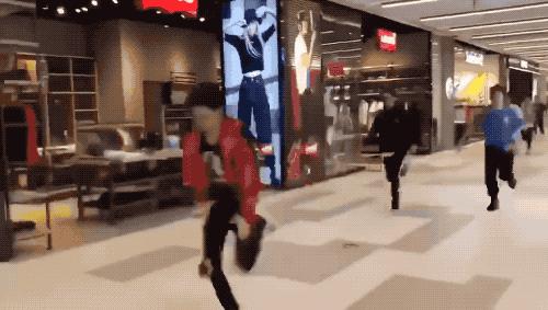 商场的走廊如同百米冲刺的赛道,身姿矫健的男生们率先奔跑进场。