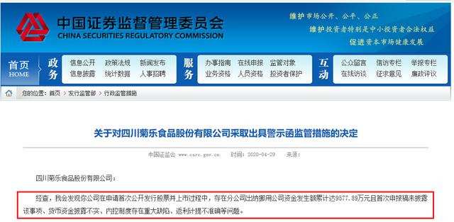 然而,菊乐食品二次提交的招股说明书却迎来了证监会的警示函。4月29日,证监会官网公布的《关于对四川菊乐食品股份有限公司采取出具警示函监管措施的决定》显示,因存在分公司出纳挪用公司资金发生额累计达9577.89万元且首次申报稿未披露该事项、货币资金披露不实、内控制度存在重大缺陷、返利计提不准确等问题,菊乐食品被证监会采取出具警示函的行政监管措施。