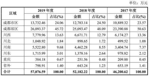除产品结构较为单一之外,菊乐食品目前还存在销售区域过于集中省内的问题。数据显示,2017 年、2018 年和 2019 年,公司在四川省内市场实现主营业务收入分别为 6.83亿元、7.69亿元和8.31亿元,占当期主营业务收入的比例分别为 98.62%、98.47%和 98.16%。