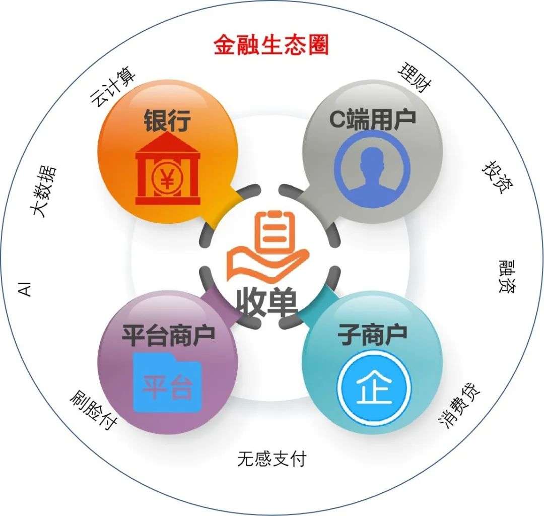 通过部门合纵,以商户为核心建立生态圈,联合个金、信用卡、三农、消费信贷、公司部、投行部、理财子公司等行内部分,输出综合服务产品包,全方位服务B端和C端客户,银行作为生态圈的参与者和金融服务提供者从延伸服务中获得收益。