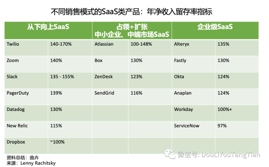比如说,从下到上的销售模式,就是我们常讲的2C2B,先以好的体验和用户口口相传,吸引消费者使用,然后由员工推动企业统一购买这个软件。这种销售模式的一个特点就是有强大的终端用户群和网络效应支持,起始订单数额小,留存率高,后续扩展潜力大,因此净收入留存率往往较高。