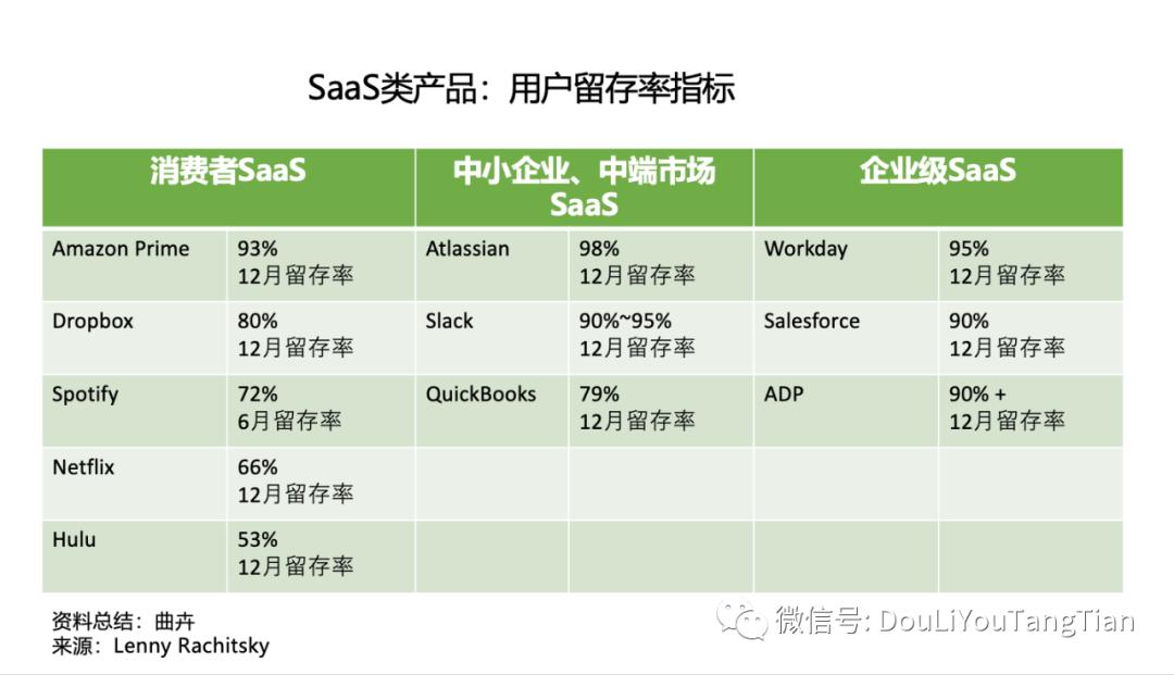 第一层是用户留存,只有终端用户持续使用,SaaS产品的价值才能被体现出来。下图总结了针对不同客户群体的三类SaaS产品的用户留存率。