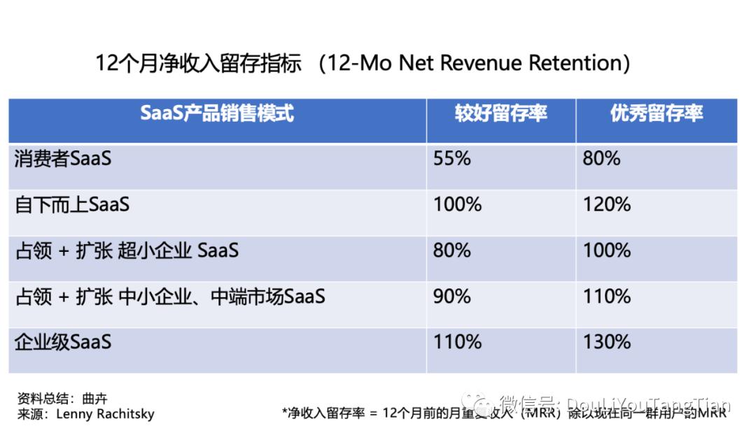 前面提到过,对于一个好的B端SaaS产品或任何一个采取订阅类收费模式的公司,最理想的净收入留存率是大于100%。