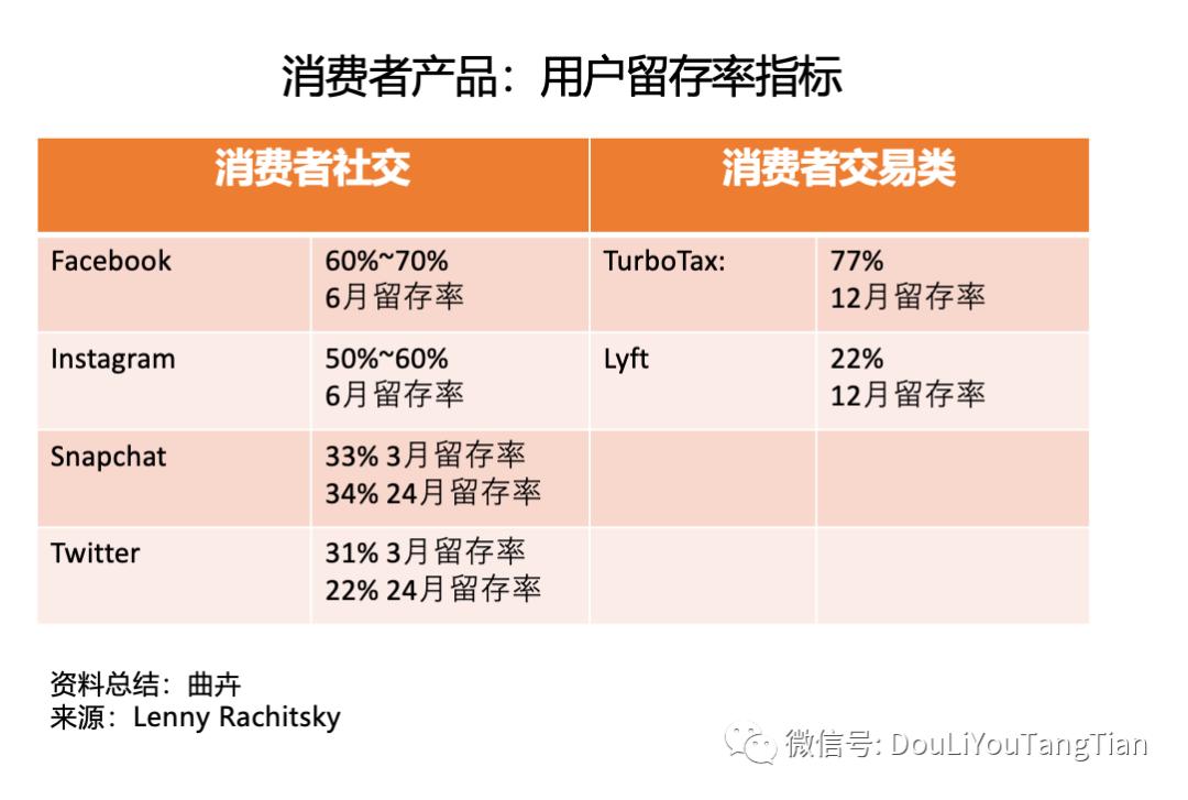 下面这张图列出了美国市场一些C端头部产品的用户留存率:可以看到在社交产品里,FB和Instagram的留存能力还是很强的;而交易类产品里的两个例子,TurboTax作为一年一度的报税产品,留存率也是相当高,而Lyft的用户留存率就差不少。