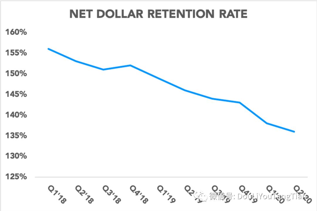 可以看到,Slack最早期的净收入留存率高达155%。随着销售模型越来越成熟,2020年第二季度最新的净收入留存率是137%,这意味着1年前给Slack贡献100美金收入的客户,现在平均贡献137美金。