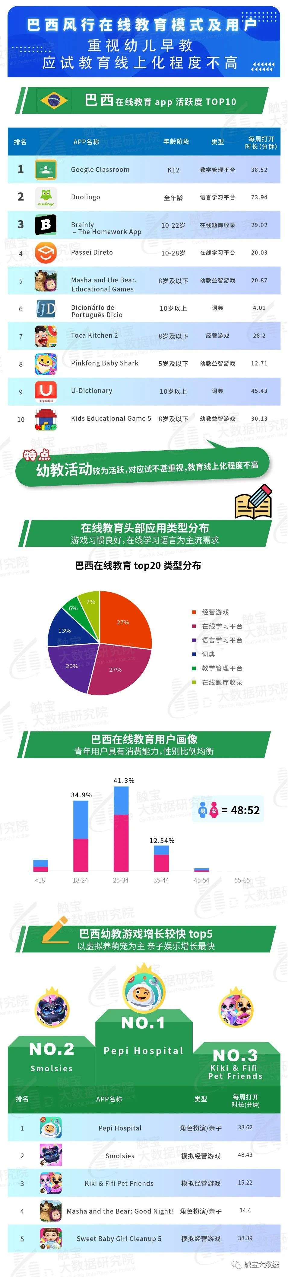 巴西作为新兴市场,用户量级较大,移动设备渗透率较高。但在线教育类线上解决方案的用户不多,线上内容学习主要以提供兴趣或语言内容学习为主,在教育类应用中早教游戏类显得更为活跃,在疫情期间移动端也代替了原本的线下娱乐项目的流量,让教育场景发生更加灵活。受这类幼教游戏影响的幼儿也将成为未来的屏幕一代,在父母的引领下一起参与游戏,对于线上游戏的多种玩法低门槛的进行学习。此外,部分一些欧洲幼教游戏在此出海,也收到了当地用户的欢迎,也与巴西和欧洲有文化亲近感有关。