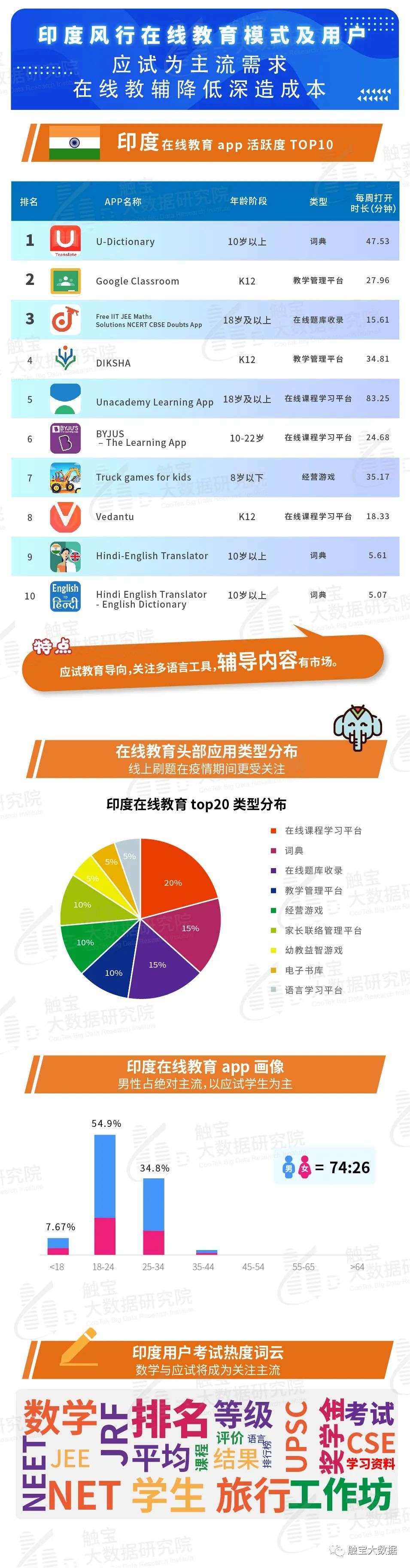 印度的在线教育市场与中国近似,应试导向极为明显。印度的年轻用户占据在线教育应用市场的主流,超过50%的用户在18-24岁的年龄段,这个年龄段的用户也正是在完成基础教育之后面临高等教育应试及职业选择的阶段,而在激烈的竞争下他们会选择通过官方考试来获得深造或者更好职位的机遇。这也是这类线上教培平台及内容学习平台获得大量年轻用户的原因,这类应用虽然对于单位用户需求频次不高,但印度学生校外补习已成风潮,有大量的用户渗透,且减轻了当地教育资源不均衡的压力。此外,由于印度当地官方语言众多,因此词典的需求也比其他市场更大。