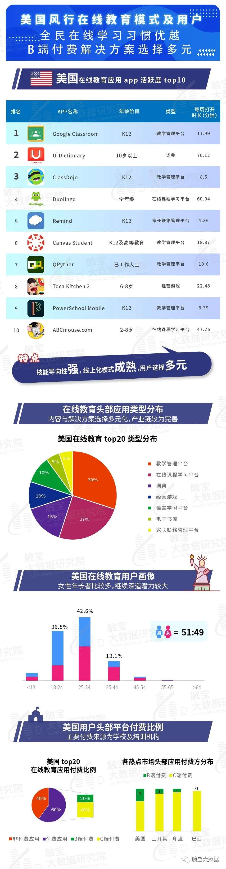 美国用户在线教育的习惯较好,在疫情影响下迅速通过谷歌等应用进行在线课堂管理。用户平均年龄偏大性别均衡,说明在线学习习惯覆盖全民,因此可挖掘的用户类型较多,对于各类教育内容均有长尾需求。
