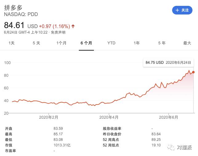 与此对应的是,拼多多市值一路高歌,突破千亿美元大关(1002亿美元),不仅超过了京东(886亿美元),还比京东高了116亿美元。
