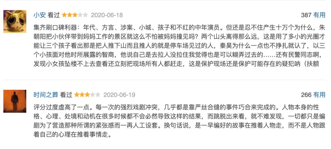 在豆瓣评论中,我们找到了一些关于剧本的吐槽,它们大致集中在“剧情过于巧合”“洗白式改编”“每集信息太少”等方面。