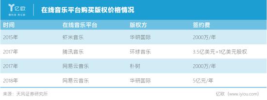 以华研国际版权为例。华研国际曲库数量约2000万首,拥有艺人包括SHE、飞儿乐队、林宥嘉等。2015年虾米音乐以2000万的价格获得华研国际三年独家代理权,但2018年合约到期后,网易云为了取得该公司版权,将价抬升至5亿元并最终拿下。