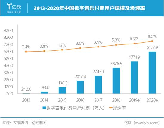 从中国在线音乐付费业务开始起步,到2020年预计达到8.0%的付费渗透率,相较过去几年而言已经实现了翻倍增长,正是数字音乐用户付费意识初步形成的体现。