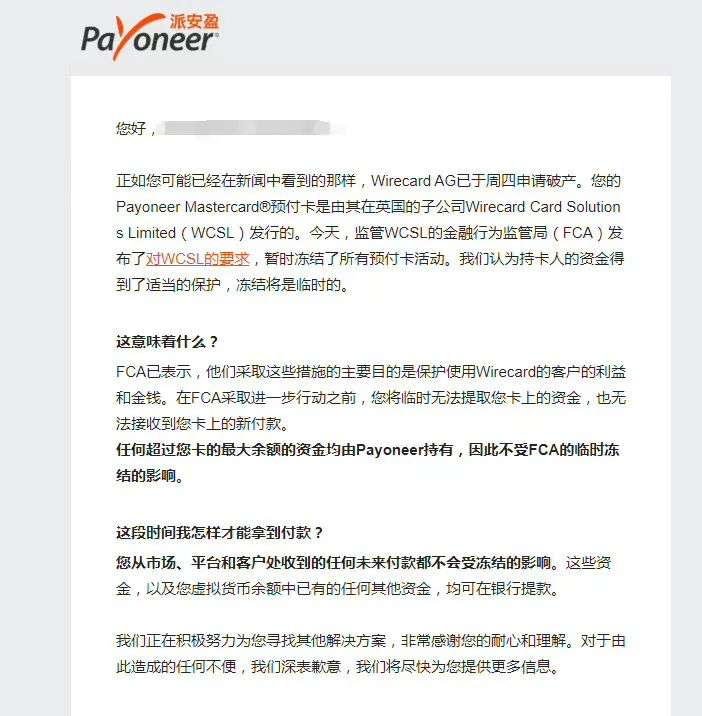 中国客户也遭受了影响。根据一份公告显示,由于Wirecard申请破产保护,其英国子公司所发行的预付卡均被英国金融行为监管局(FCA)冻结,在FCA采取进一步行动前,用户将无法提取资金,也无法接收到卡上的新付款。