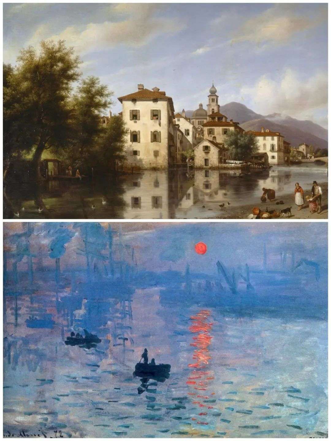 上边的画是朱塞佩·卡内拉的写实作品《伦巴第的景色》,下边的画是著名的印象派代表人物莫奈代表作《印象·日出》。