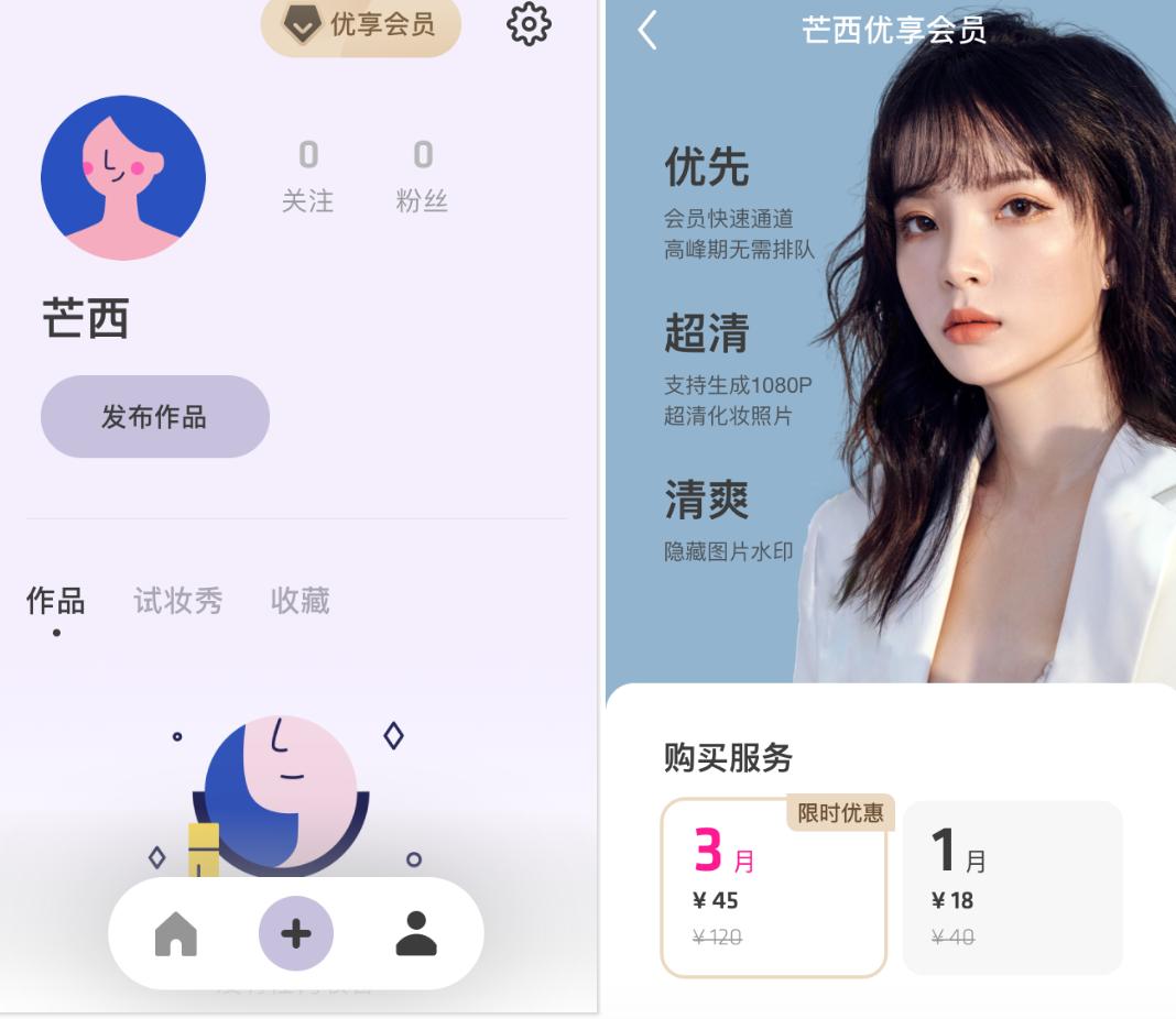 而个人中心里,除了用户的基本信息外,还有用户发布的仿妆动态和试妆的内容。值得注意的是,芒西还推出了优享会员这个增值业务,据介绍,芒西优享会员的价格为一个月18元。可以享受快速联系客服、支持生成1080P超清化妆照片以及隐藏图片水印等特权。