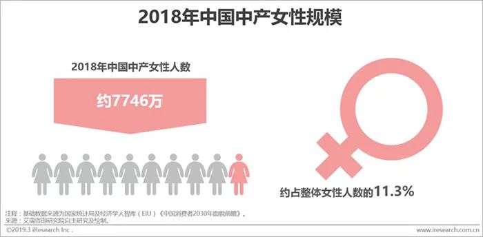 根据唯品会和艾瑞咨询,2019年3月发布的《中国中产女性消费报告》显示,截至2018年,中国拥有大约7746万中产女性,其中一二线城市,30岁以上的占到51.8%,三四线小城占到了59%。