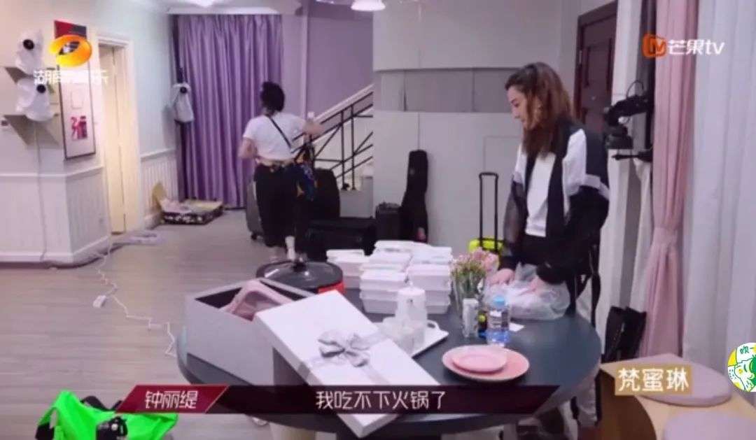 但第二期公演学舞中,收工后又累又饿的姐姐们,面对桌子上晓明送的火锅,双眼放光,尖叫、欣喜3秒钟后,礼貌而又不失尴尬地拒绝了。