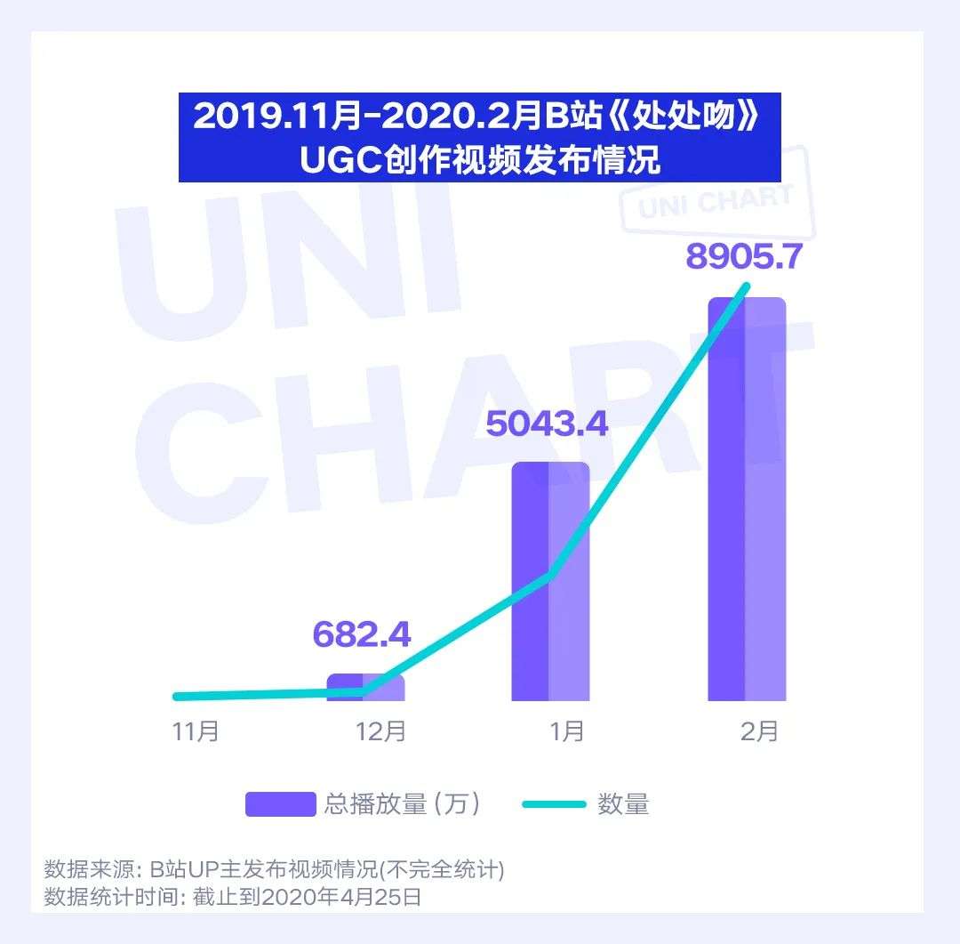 但是,观察播放曲线下不难看出,在1月迎来全面爆发之前,在2019年12月《处处吻》曾经迎来了一个小的播放高峰。这是缘何呢?追根溯源《处处吻》流行的源头——B站的女星港风群像剪辑视频,最初播放量突破30万的UGC视频,是在2019年10月26日。但是接下来的几个月里,《处处吻》作为剪辑BGM被不同UP主在圈层内的接连引用后,开始出现了小范围热潮,直到2020年1月,才迎来了第一个破千万播放量视频,也进而带动了歌曲的全面出圈。这也是12月歌曲播放量会迎来小范围高峰的原因。