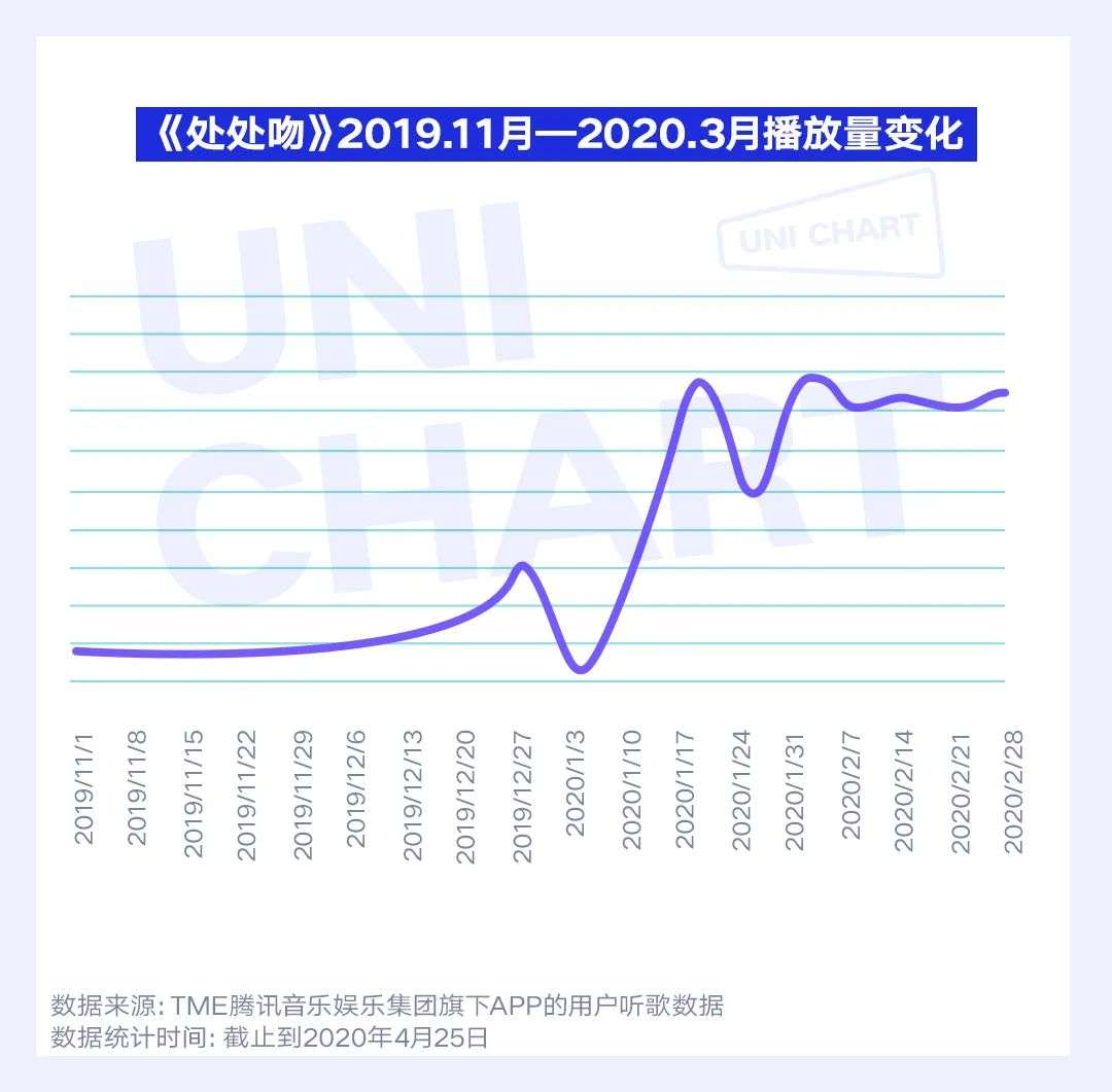 以杨千嬅的《处处吻》为例,从歌曲播放量走势曲线上可以很明显的看出,2020年1月—2月,歌曲热度呈爆发式增长,增长率达到惊人的1205%。从时间节点上看,正好契合《处处吻》作为一个流行热点在视频与短视频平台引发UGC创作的热潮期。