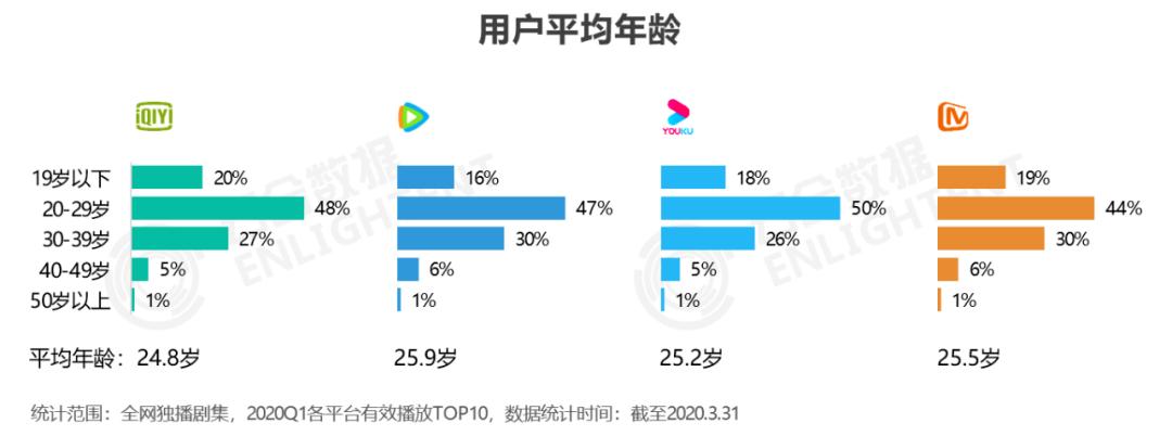 根据云合数据今年Q1剧综复盘的数据显示,四大平台独播剧用户平均年龄在25岁左右,芒果TV的受众平均年龄为25.5岁,在行业平均年龄之上;四大平台独播综艺用户平均年龄为24.4岁,芒果TV用户年龄平均年龄为24.2岁。