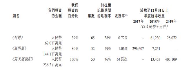 此外,在风险因素方面,华夏视听提到,其影视制作业务取决于每年发行的少数新片能否成功。这意味着,任何一个商业失败或制作延后都有可能对华夏视听造成重大不利影响。以2017-2019年为例,其影视制作业务总收入的98.9%来自四部电视剧,即《神雕侠侣》《封神》《凤囚凰》《倚天屠龙记》。其中,2016年开始制作的《封神》,就由于对若干主演的禁令而导致相关内容被删除,制作时间延长至2018年。