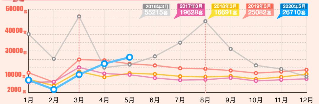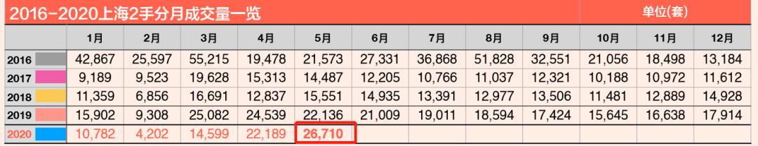 2.67万套,环比增长了16.5%,各位这个2.67万套的成交数据是什么概念,上海从2016年10月至今,只有5个月是突破2万套的,在这整整44个月里,2020年5月的二手房成交直接站到了最高值。