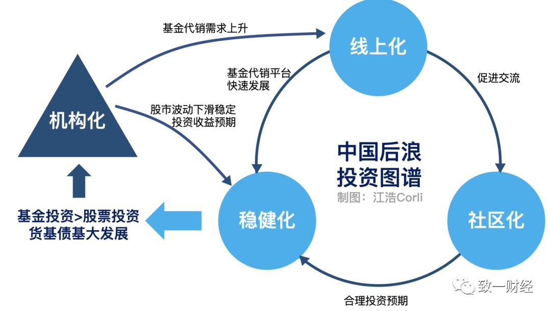 互联网渠道的理财方式带来独有的投资社区化生态,社区化生态带来更理性的投资偏好,于是基金投资迎来投资群体和投资规模的大发展,进场散户减少、存量散户交易减少促进A股的机构化,基金的代销需求上升、股市波动减少,进一步促进互联网基金代销平台的发展、稳定投资收益预期,形成良性循环。
