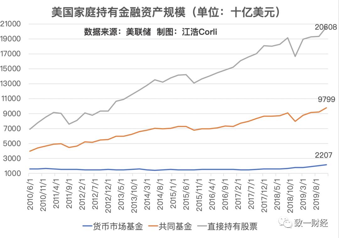 我使用美联储Flow of Funds对美国家庭金融资产的统计数据(Balance Sheet of Households and Nonprofit Organizations),从2010年第二季度到2019年第四季度,家庭直接持有股票的年增长率为7%,但是共同基金(也就是公募基金)的年增长率为3.7%,几乎只有股票增速的一半。