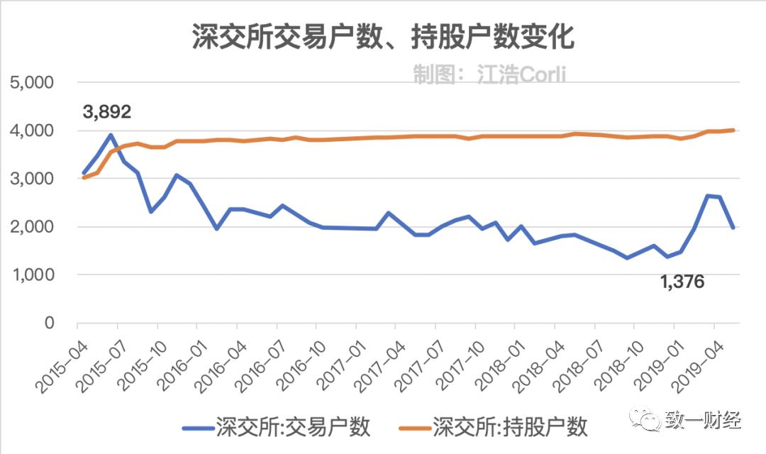 从交易的结构来看,深交所的交易户数从3892万一路下滑到1376万(下跌65%),直到今年疫情影响才出现波动,但是大趋势就是交易的散户越来越少。