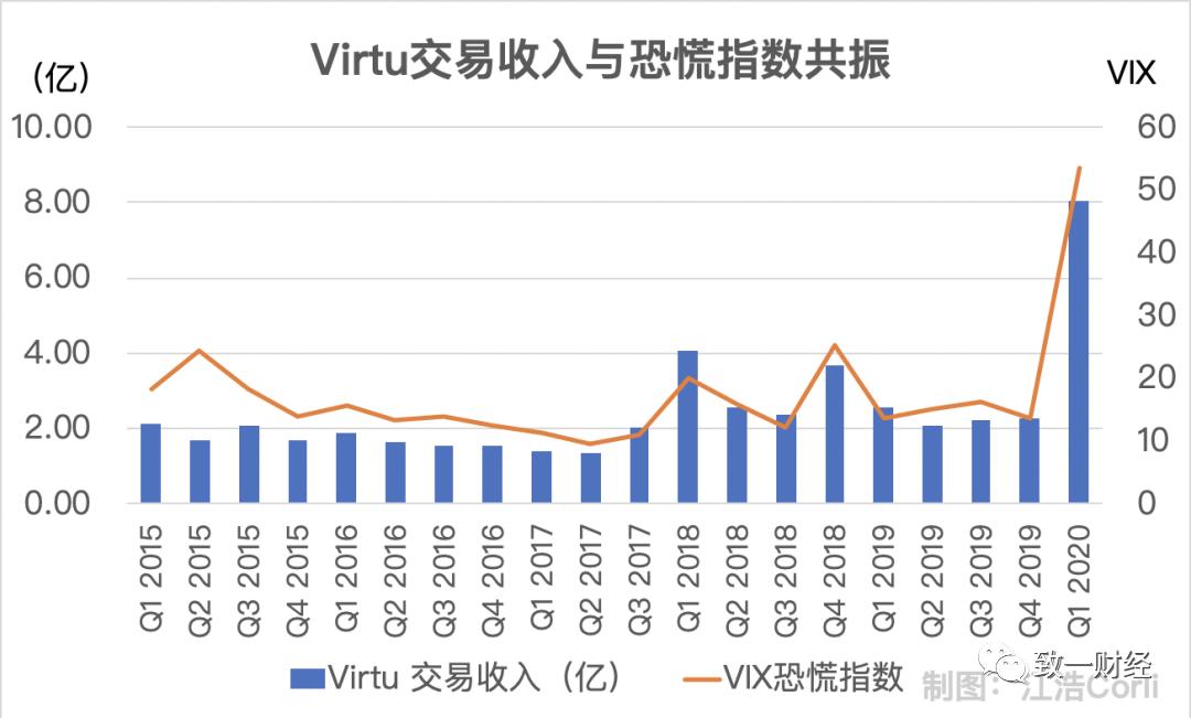 (左轴/柱状图:Virtu交易收入;右轴/折线图:VIX指数,反映股市整体波动率)