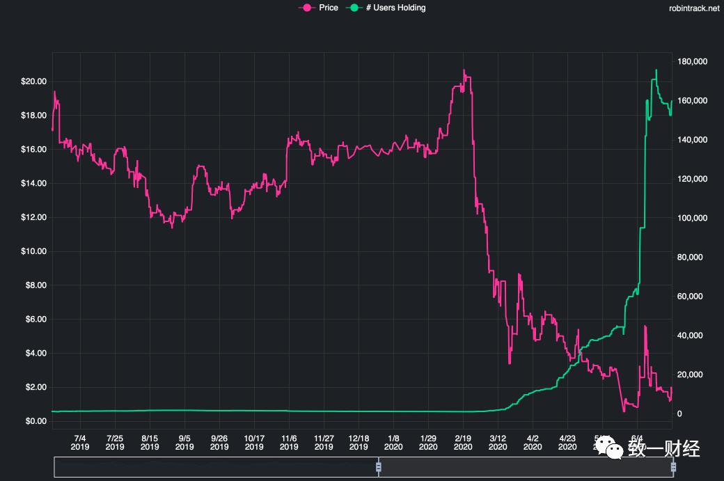 类似的还有赫兹租车,因为疫情影响、负债高企,申请破产后三个交易日内居然暴涨710%,但是都是散户在冲锋陷阵:绿色的是散户持股情况,红色的是赫兹股价。在赫兹暴跌之后,散户的持股量一直在稳步上升,到了6月4日持仓量跟随股价暴涨而暴涨。