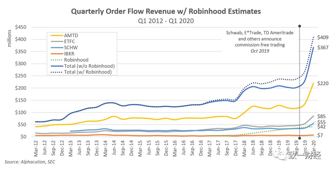 “幸好”在今年一季度美股暴跌,各家经纪公司的交易订单暴涨、PFOF返点收入暴涨,可以一定程度上弥补免佣金带来的损失。各大公司快速跟进免佣金以后,行业整体PFOF返点收入都暴涨,TD Ameritrade和E*Trade的返点收入增速都远远高于Robinhood。