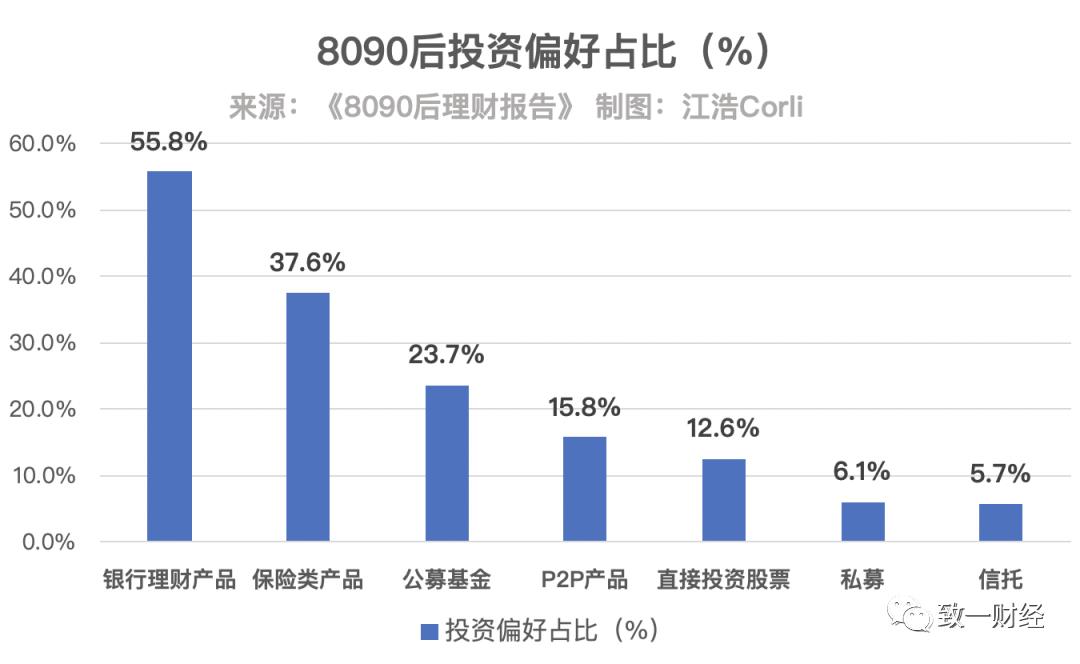 从需求侧来看:后浪们也更加偏好基金投资而不是直接投资股票:根据腾讯理财通《8090后理财报告》,偏好直接投资股票的年轻人占比只有12.6%,只有偏好公募基金的一半,甚至低于P2P理财产品。