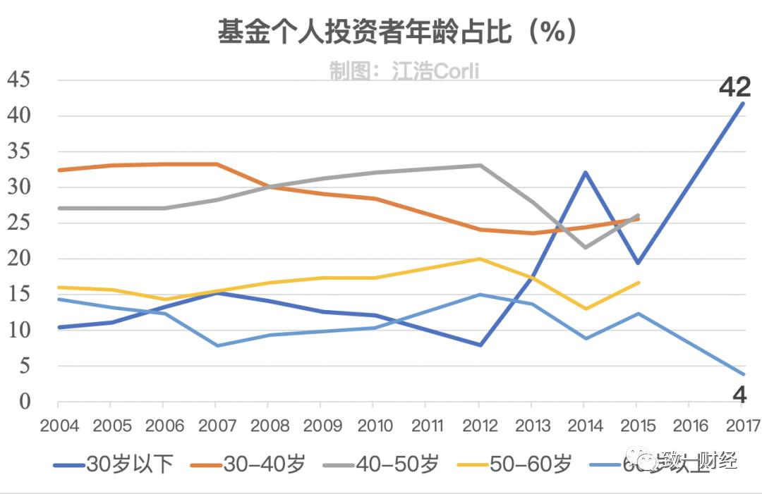 由于可获得、可信的数据并不多,这里先用中国证券业协会披露的基金个人投资者占比一窥究竟,2015年30岁以下的投资者占比值只有19%,但是到了2017年瞬间跃升42%,而且这是所有年龄段有史以来最高的占比(相反60岁以上的投资者从牛市的12%跌到4%)。年轻人投资理财的时代来了。